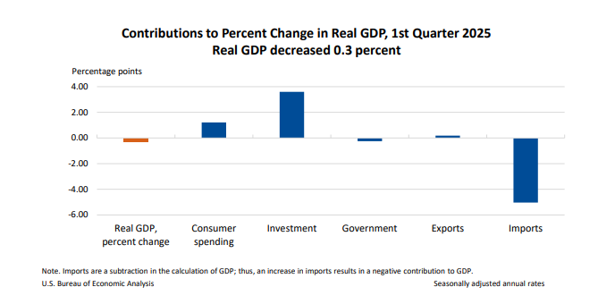 The biggest drag on growth was trade and lower government spending, according to the BEA. A surge in imports weighed on growth to the tune of 4.8%. This is the most on record and it suggests that the impact of US trade tariffs is impacting business behavior, with businesses front loading imports of goods to try and avoid reciprocal tariffs. However, the surge in imports also has some intricacies, which could blunt the negative impact of Q1 GDP. These include: