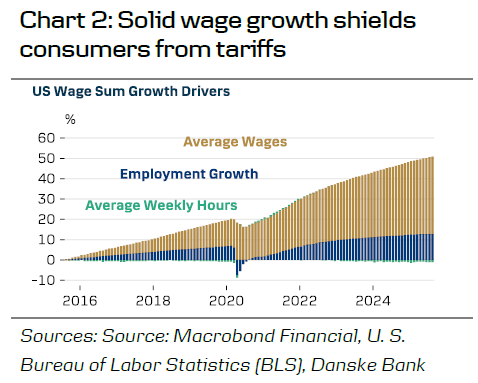 Despite signs of moderation, wage growth remains robust. With an annualised pace of 4.4%, wage sum growth, driven by rising nominal wages (chart 2), continues to shield consumers from cost pressures and support demand. Importantly, the labour income share remains historically low (chart 3), enabling firms to absorb higher wages without straining profit margins.