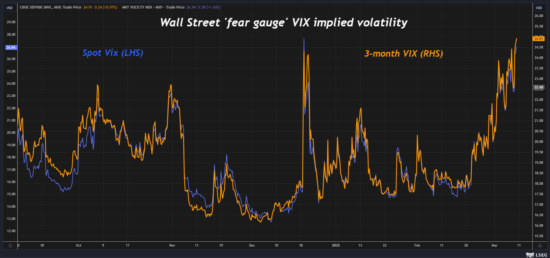 Wall Street got steamrolled Monday as risk aversion took center stage, sending US stocks tumbling, Bitcoin reeling, and the VIX—the market’s so-called “fear gauge”—spiking to its highest level of the year. The culprit? Mounting concerns that Trump’s economic shake-up could knock the US growth engine off its axis, triggering a recession, hence the widespread risk-off move.
