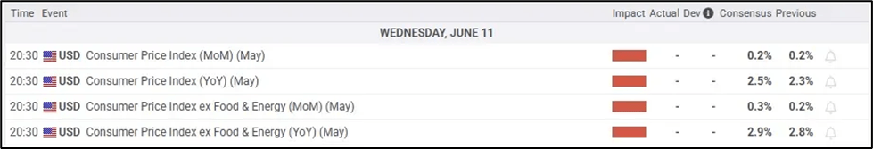 - Headline CPI YoY (May): 2.5% (Prev: 2.3%).