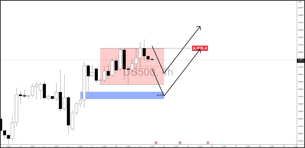 The S&P 500 mirrors Nasdaq’s posture, consolidating tightly just under 6,035, with rejection wicks and no strong displacement yet.