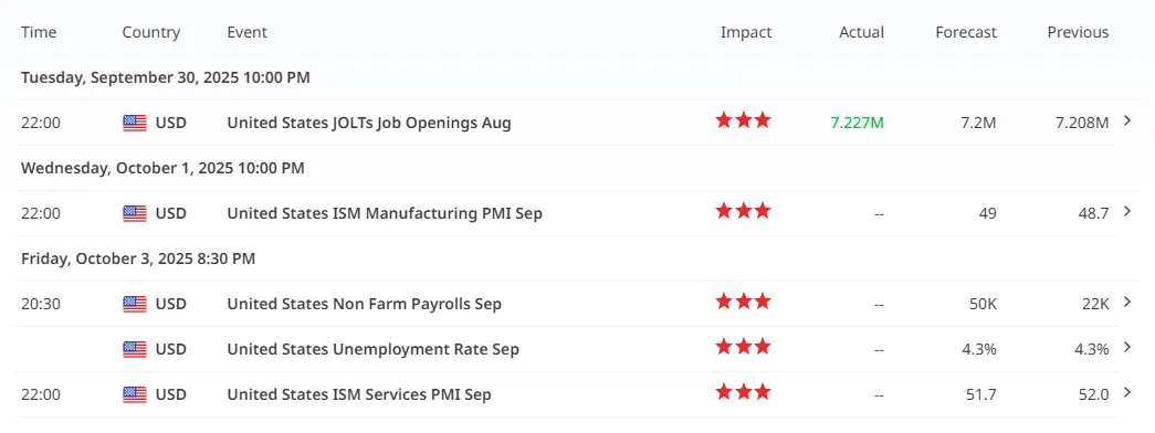 This Friday’s Nonfarm Payrolls (Sep) is now the most important test. The forecast is +50K, but given recent softness, risks tilt lower. Alongside it, the unemployment rate (expected 4.3%) and ISM Services PMI will further shape Fed expectations.