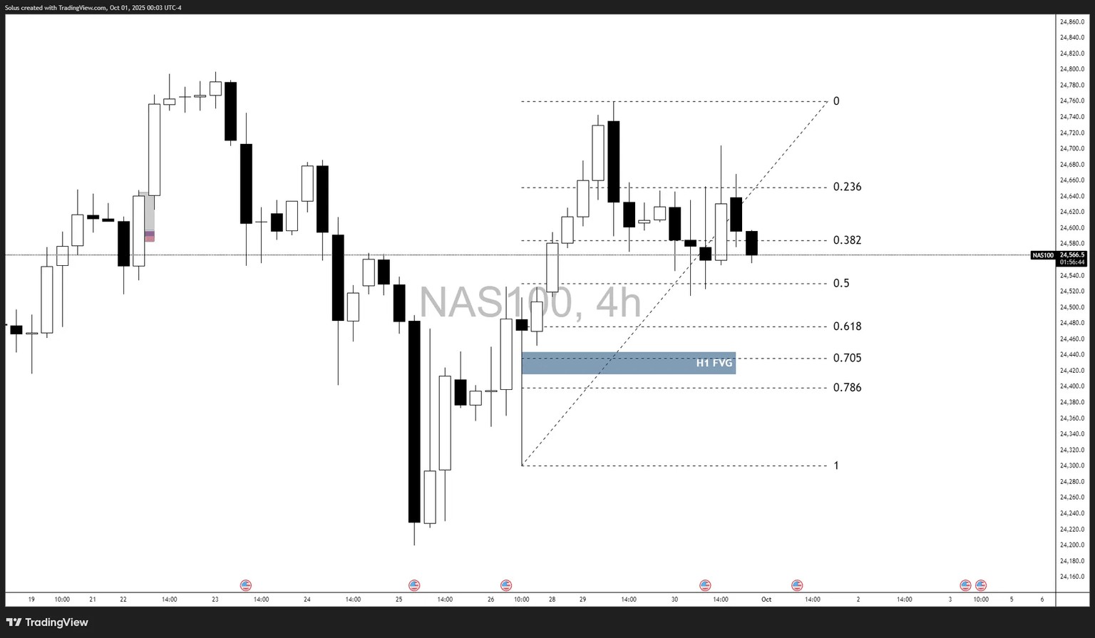 Currently trading near 24,580, the Nasdaq is holding the 0.382 Fibonacci retracement. A visible H1 FVG sits lower at 24,420–24,460. Momentum is capped below 24,700.