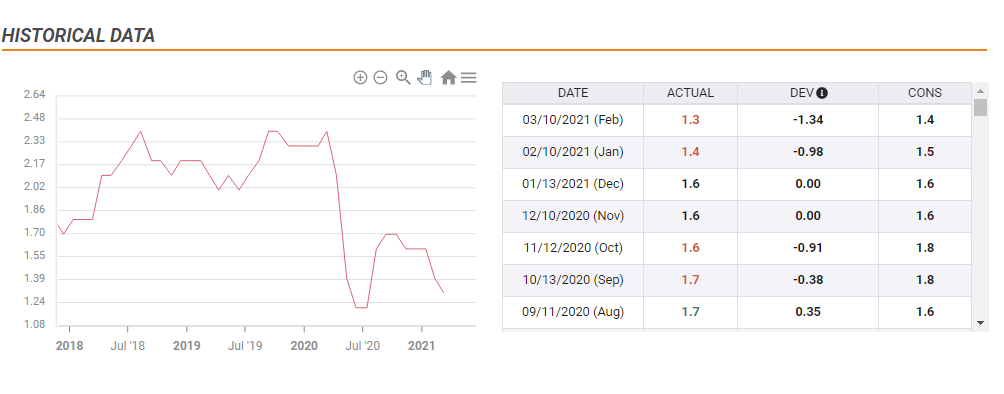 The central bank focuses on Core CPI – underlying inflation which excludes volatile items such as food and energy. The economic calendar is pointing to an acceleration from 1.3% in February to 1.6% in March, which would still leave core prices below the Fed's 2% objective.
