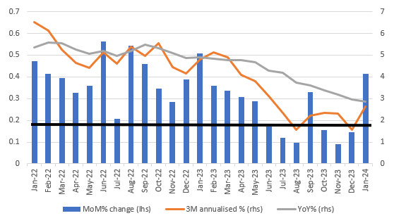 While today's number in itself is too hot for the Federal Reserve to contemplate an imminent rate cut, we have to acknowledge that for six out of the past eight months we have been tracking below the 0.17% MoM rate we need to consistently hit to bring annual inflation back to 2% over time. While February may also remain a little hot (remember lots of services change their fee structure at the start of the year), we look for a return to numbers in the 0.2% area from March onwards, helped by factors elsewhere in the personal spending and income report.