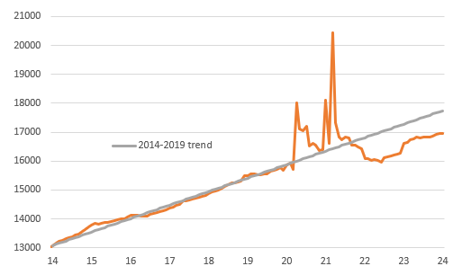 January personal income did rise a lot more than expected, increasing 1% MoM versus the 0.4% consensus with worker compensation increasing 0.4% MoM, dividend income jumping and a 2.6% increase in transfer payments, largely reflecting the cost of living adjustment (3.2%) for social security recipients. However, importantly, there was a 6% MoM increase in tax payments and with inflation still eating into spending power, real household disposable income was a very disappointing 0% MoM. Given this is the primary source of funds to fuel real consumer spending growth in an environment where households have largely run down pandemic era accrued savings and the costs of consumer credit are so high, this suggests that 2024 spending growth should trend quite a bit softer than in 2023.