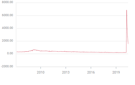 Though claims will be down 87% from that March peak, the more relevant comparison is between the four week moving averages, 2.002 million in the week of June 5 and 232.5 thousand in the March 13 week, an increase factor of 8.6 or 860%.