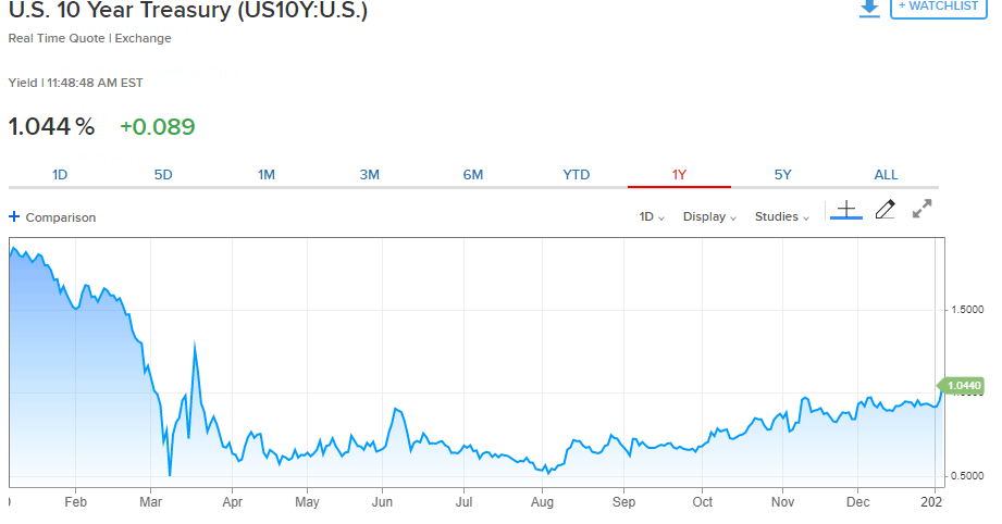 The 10-year Treasury yield was at 1.044% (11:49 am EDT) its first rise above 1% since the Fed's pandemic intervention in March.