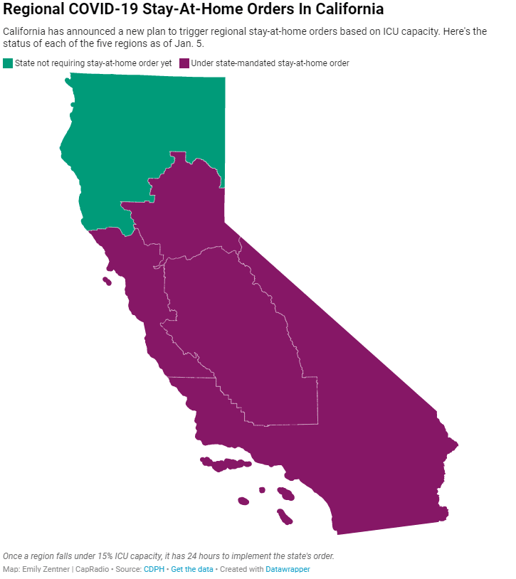 The Golden State's economy is languishing under the most draconian business and socialization restrictions in the country. Parts of California have been under stay-at home orders since December 6 with the southern two-thirds of the state currently locked down. Closure is determined by intensive care unit utilization. When regional capacity falls below 15%, it has 24 hours to implement the state's restrictions.