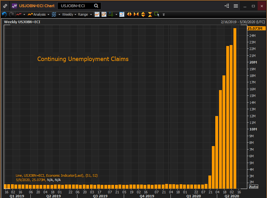 The shock dealt to markets by the first three unemployment claims numbers on March 20, 27 and April 3 and reinforced by the April non-farm payrolls loss of 20 million jobs in early May have largely inured traders to the dismal statistics that have followed.