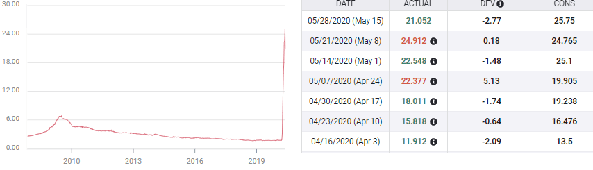 The drop in continuing claims in the week of May 15, 2.446 million new claims were filed that week, is the first evidence that the reopening of many state economies that started with Georgia on April 26 has started to pull people back to work, removing them from the benefits list.