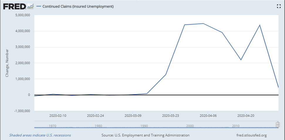 As states continue to remove restrictions on businesses and rehiring occurs it is expected that the returning workers will leave the continuing claims list. That reduction has not yet happenied.