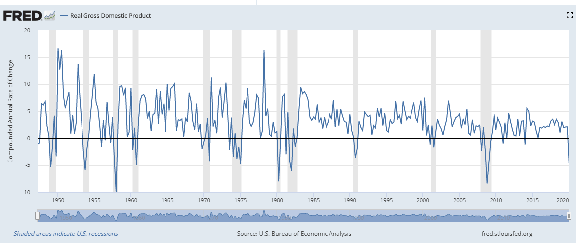 To give a sense of the magnitude of this debacle, since the Second World War the three worst quarterly declines in annualized GDP were -9.98% in the first quarter of 1958, -8.38 in the fourth quarter of 2008 and -7.99% in the second quarter of 1980.