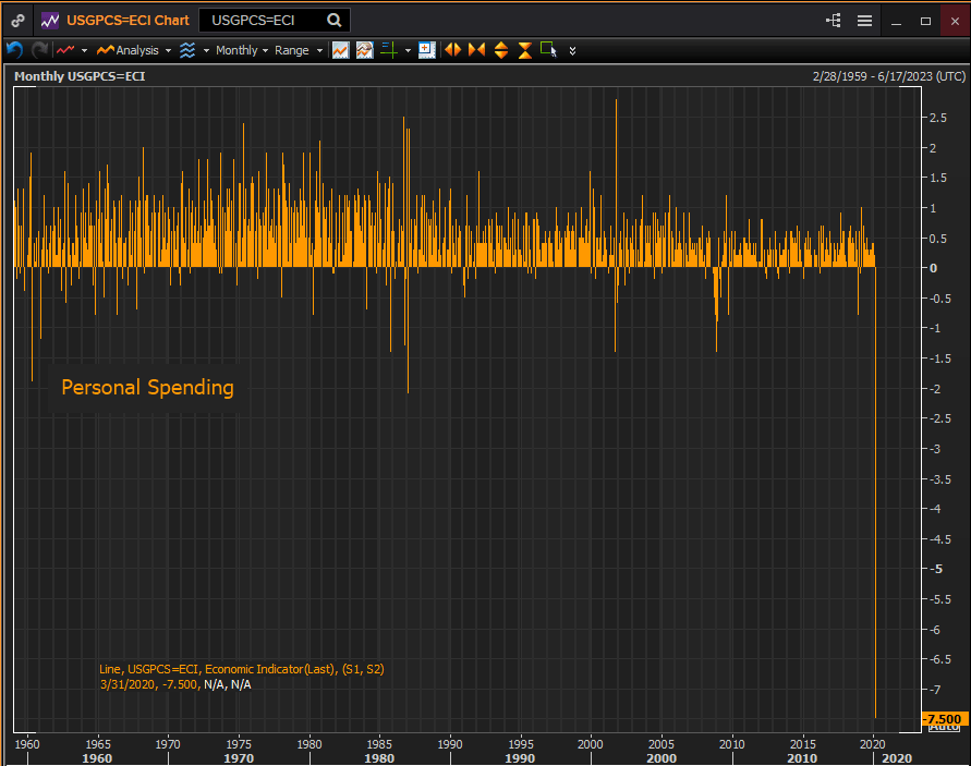 Personal spending collapsed 7.5% in March, more than three times the next largest monthly decline of 2.1% in January 1987, according to the Bureau of Economic Analysis, in a series that goes back to 1959. Personal income decreased 2% in March down from 0.6% in February.