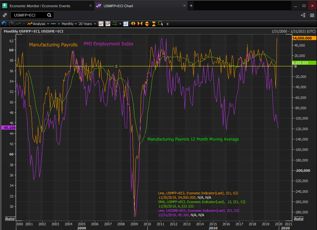 The decline in manufacturing employment has followed the sharp decrease in the employment index. Factory jobs rose an average of 22,000 a month in 2018. By November of last year that was down to 5,000.