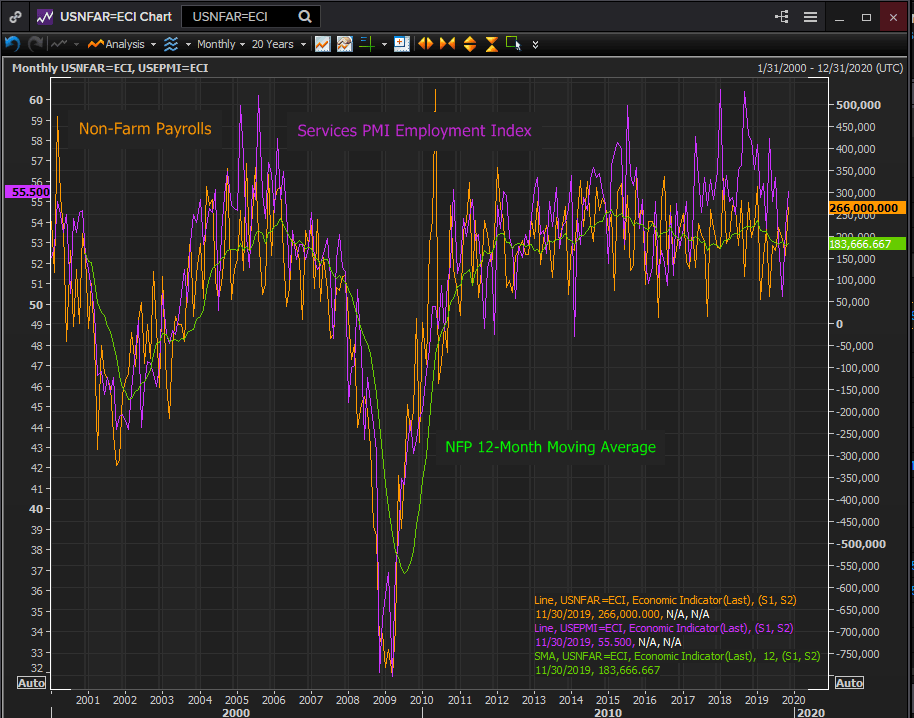 In contrast to the sentiment indexes the actual, the consumer sector has remained strong with healthy retail sales and a vibrant labor market. Unemployment is at a five-decade low at 3.5%, 266,000 new jobs were added in November and a 184,000 12-month moving average.