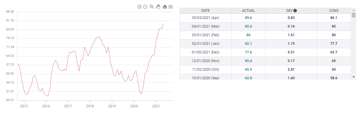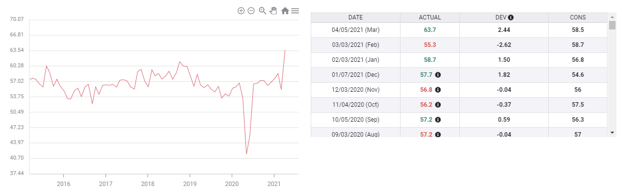 With coronavirus vaccinations in the US continuing at full steam, it wouldn’t be a big surprise to see the service sector preserving its momentum. On a similar note, the IHS Markit’s Flash Composite PMI report revealed that the Services PMI reached a new series high of 63.1 in April.