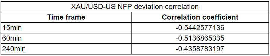 Finally, we calculated the correlation coefficient (r) to figure out at which time frame gold had the strongest correlation with an NFP surprise. When r approaches -1, it suggests there is a significant negative correlation, while a significant positive correlation is identified when r moves toward 1. Since gold is defined as XAU/USD, an upbeat NFP reading should cause it to edge lower and point to a negative correlation.
