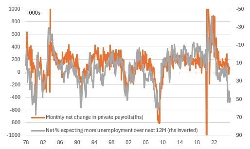 U. of Michigan employment expectations versus the change in private Payrolls (000s)