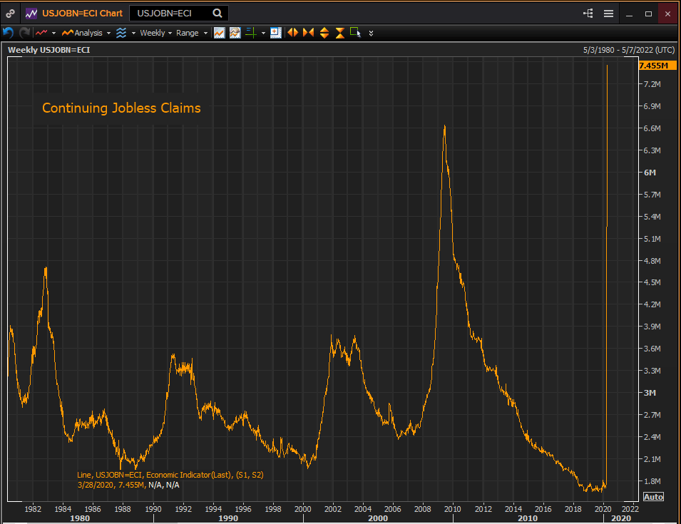 Initial claims have provided a great shock to the markets and a boost to the dollar over the past three weeks, chronicling job losses far greater than anyone had anticipated. The impact of the virus on the US and the global economy is an evolving proposition. Markets that were responding to fears and conjecture in the early weeks of March now have some measure of the catastrophe. These new facts retain the ability to move markets despite the already great dislocations.