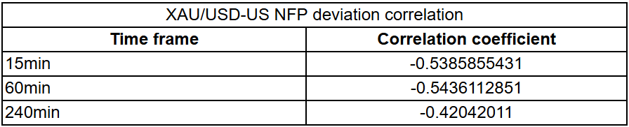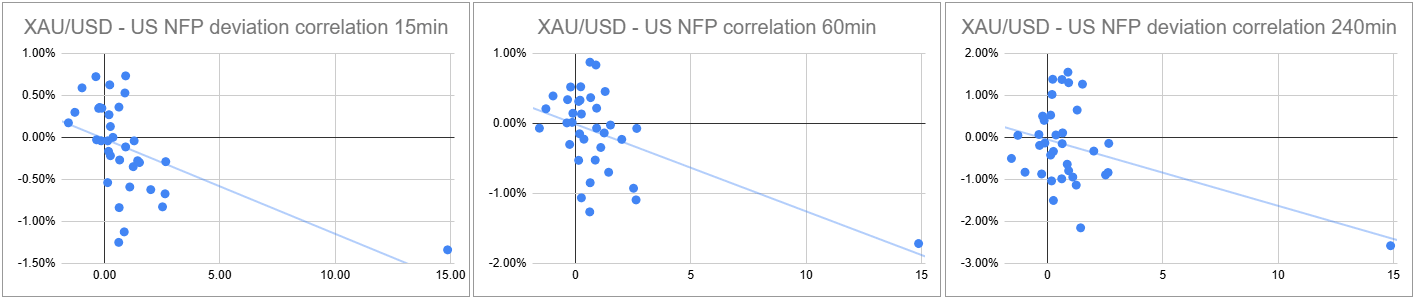 We plotted the gold's price reaction to the NFP print at 15-minute, one-hour, and four-hour intervals after the release. Then, we compared this reaction to the deviation between the actual NFP release result and the expected figure.