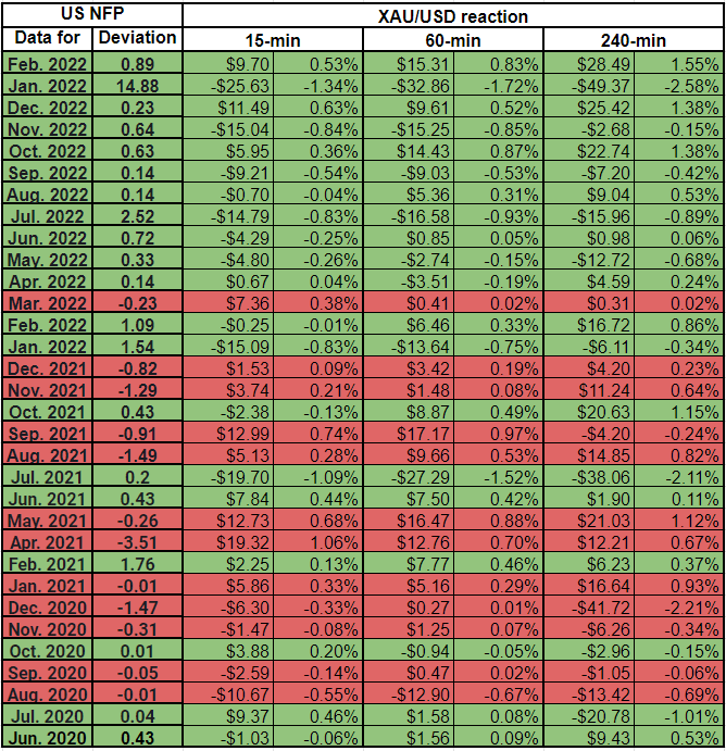 *We omitted the NFP data for March 2021, which was published on the first Friday of April, due to lack of volatility amid Easter Friday.