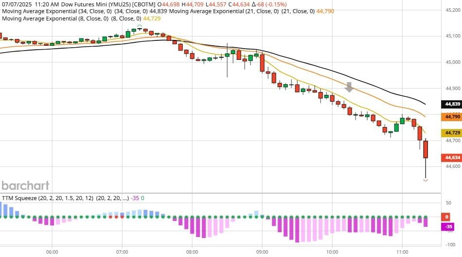 Yesterday the ZT leaped Higher at around 10:30 AM EST with no eco news pending. The Dow dived Lower at the same time. Look at the charts below and you'll see a pattern for both assets. The Dow dived Lower at 10:30 AM EST and the ZT climbed Higher at around the same time. These charts represent the newest version of Bar Charts, and I've changed the timeframe to a 15-minute chart to display better. This represented a Long opportunity on the 2-year note, as a trader you could have netted about 20 plus ticks per contract on this trade. Each tick is worth $6.25. Please note: the front month for ZT is now Sep '25 and the Dow is now Sep '25. I've changed the format to filled Candlesticks (not hollow) such that it may be more apparent and visible.