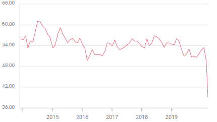 In the Euro zone the composite purchasing managers’ index plummeted to 31.4 in March from 51.6, its lowest on record and the largest one-month decline in the 22-year history of the series. The consensus prediction was 38.8.
