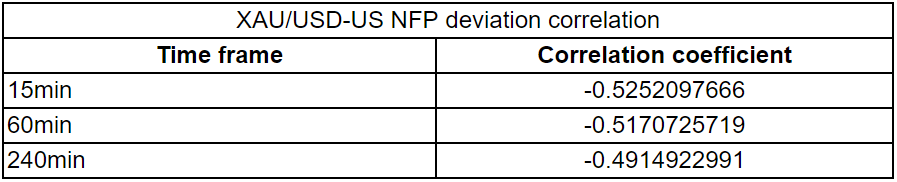 Finally, we calculated the correlation coefficient (r) to figure out at which time frame gold had the strongest correlation with an NFP surprise. When r approaches -1, it suggests there is a significant negative correlation, while a significant positive correlation is identified when r moves toward 1. Since gold is defined as XAU/USD, an upbeat NFP reading should cause it to edge lower and point to a negative correlation.