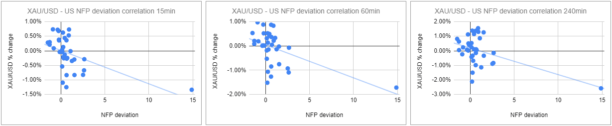 We plotted gold price’s reaction to the NFP print at 15 minutes, one hour and four hours intervals after the release. Then, we compared the gold price reaction to the deviation between the actual NFP release result and the expected result.