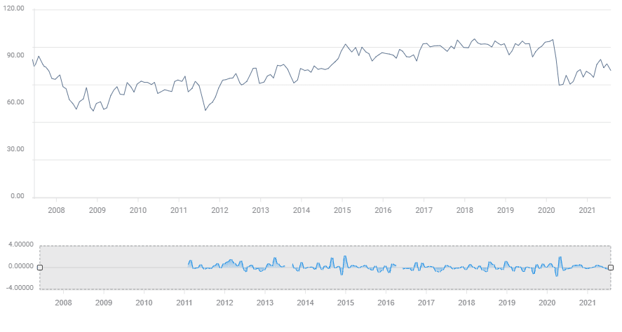 - Sentiment forecast to be unchanged at 81.2 in August, near midpoint of pandemic range.