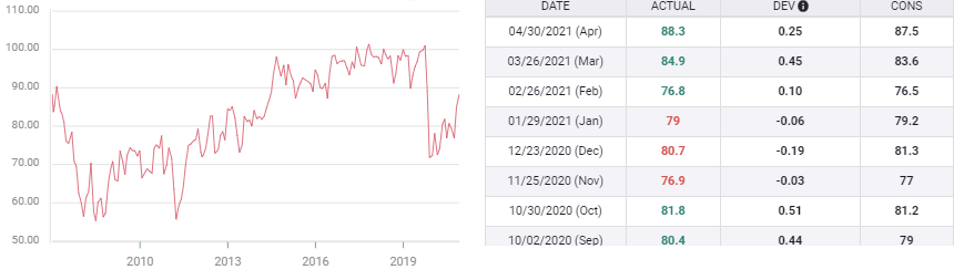 The Michigan Consumer Sentiment Index is expected to rise to 90.4 in May, which would be the third pandemic high in a row, following 84.9 in March and 88.3 in April. Sentiment was 101 last February before the government ordered lockdowns struck the economy in March and April