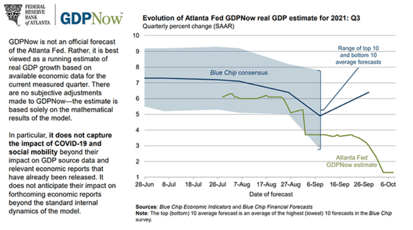 The impact of labor and supply shortages on the US economy has been substantial. The Atlanta Fed’s GDPNow estimate for the third quarter has fallen steadily from over 6% in August to just 1.3%. The next revision is after Retail Sales on Friday October 15.
