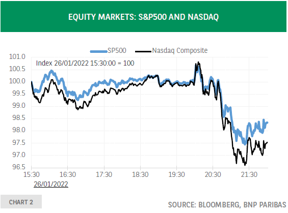 The FOMC sees “the target rate for the federal funds rate as its primary means of adjusting the stance of monetary policy”, whereby the balance sheet would decline in a predictable manner. This reflects the view that the consequences of rate hikes are easier to estimate compared to those of QT. Unsurprisingly, bond yields jumped (chart 1) with the 2-year yield rising slightly more than the 10-year yield, equity markets declined – the more rate-sensitive Nasdaq more than the S&P500 (chart 2) – and the dollar strengthened (chart 3).