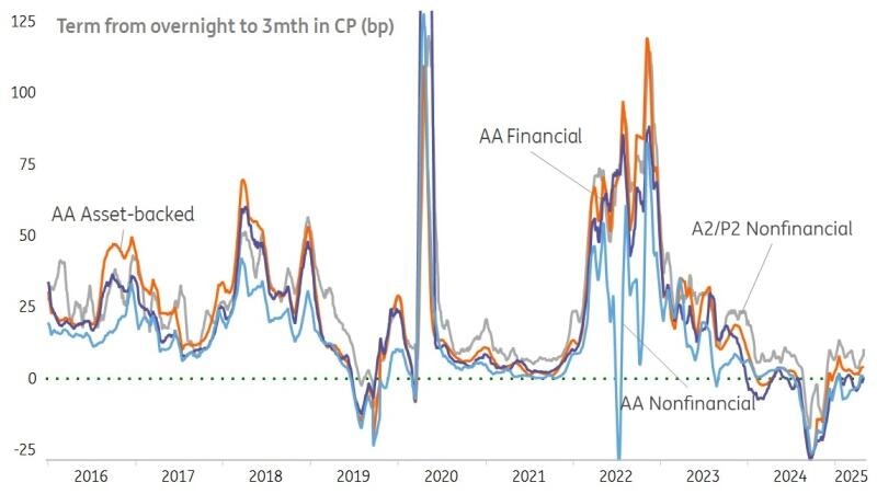 Three-month AA financial commercial paper is trading broadly flat to a few basis points above overnight rates. In the A2/P2 non-financial and AA-asset backed, the evolution of some terms is a tad wider.