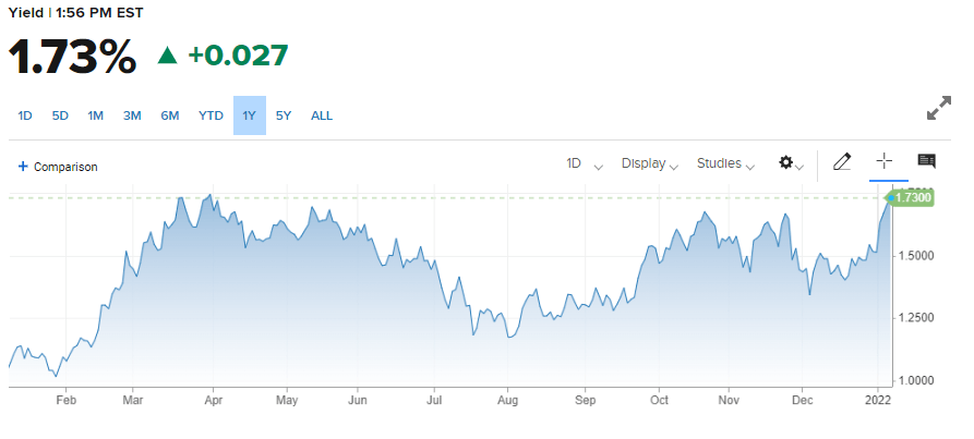 Treasury yields continued their January surge. The 10-year yield rose to 1.730% on Thursday afternoon, its highest since April 2021. It has added 22 basis points in the four days of 2022 trading since closing at 1.512% on December 31. The 30-year return was at 2.095%, up 19 basis points from its year end finish at 1.905%.