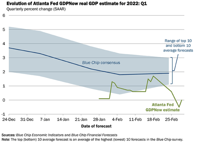 The Atlanta Fed’s GDPNow model gives a glimpse of the potential damage a prolonged conflict could inflict. Its latest estimate for the first quarter is zero growth.