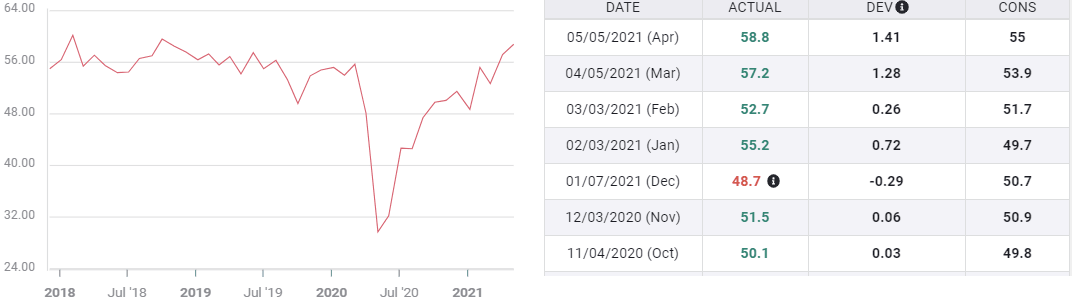 The service sector continued to soar. Overall PMI jumped to 64 from 62.7, a more than decade high. New Orders climbed to 63.9 from 63.2, far more optimistic than the 57.9 consensus estimate. Only Employment PMI showed hesitation, dropping to 55.3 from 58.8, missing the 58 prediction. Managers in both sectors noted material shortages and difficulty in finding qualified personnel.