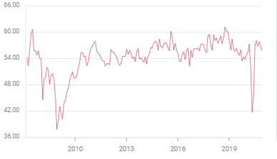 Since the recovery began in earnest in June economists have had difficulty judging the the amount of new business being generated. The manufacturing index has averaged 63.1 from June and has beaten its consensus estimate by an average of 14.8 points each month.