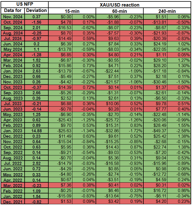 We plotted the gold's price reaction to the NFP print at 15-minute, one-hour, and four-hour intervals after the release. Then, we compared this reaction to the deviation between the actual NFP release result and the expected figure.