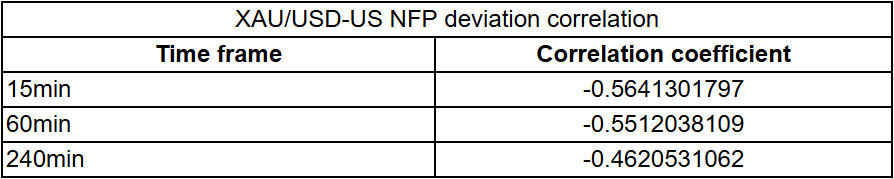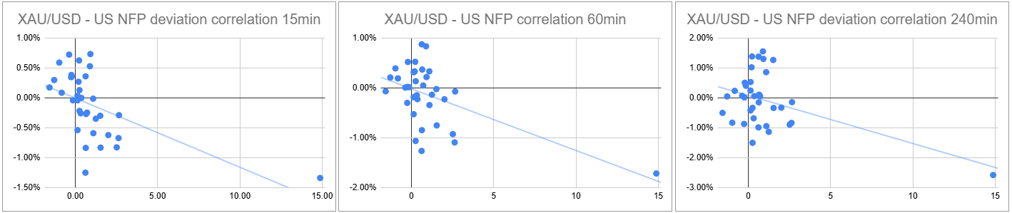 - Previous data analysis shows that gold's price inverse-correlation with NFP surprise weakens slightly by the fourth hour after the release.