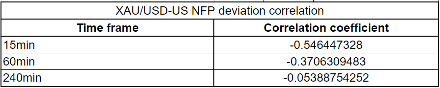 Finally, we calculated the correlation coefficient (r) to figure out at which time frame gold had the strongest correlation with an NFP surprise. When r approaches -1, it suggests there is a significant negative correlation, while a significant positive correlation is identified when r moves toward 1. Since gold is defined as XAU/USD, an upbeat NFP reading should cause it to edge lower and point to a negative correlation.