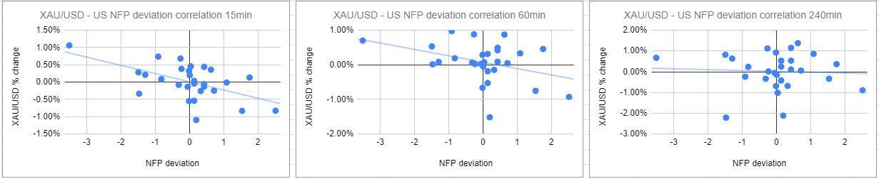 We plotted gold price’s reaction to the NFP release at 15 minutes, one hour and four hours intervals after the release. Then, we compared the gold price reaction to the deviation between the actual NFP release result and the expected result.