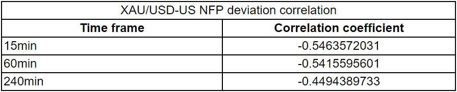 We plotted gold price’s reaction to the NFP print at 15 minutes, one hour and four hours intervals after the release. Then, we compared the gold price reaction to the deviation between the actual NFP release result and the expected result.