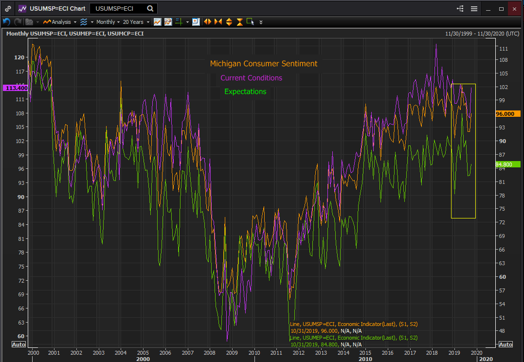 The Michigan Consumer Sentiment Index recovered to 96 in October from 92 in September. This puts it in the middle of the range of the last two years which have seen the highest sustained reading in two decades.