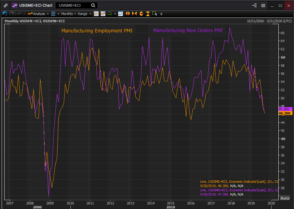 Over the past year sentiment in manufacturing has had the steepest decline since the recession and financial crisis. From 60.8 in August 2018, a 15 year high, the purchasing managers’ index dropped into economic contraction in August with 49.1 and 47.8 in September.