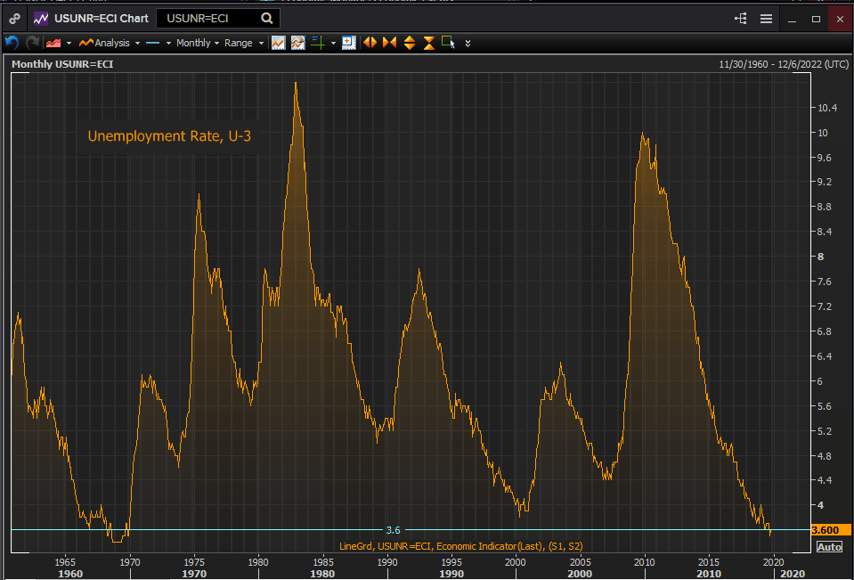 Non-farm payrolls have averaged 167,000 a month through October and 174,000 over the past year, well above the 125,000-150,000 needed to provide work for first time workers. Annual wages have gained 3% or more for 15 consecutive months and the 3.6% unemployment is nearly a 50 year low. The jobless rate has been at or below 4% for 20 months the longest run since the last half of the 1960s and the majority of that time, 17 months out of 20, the rate has been below 4%.