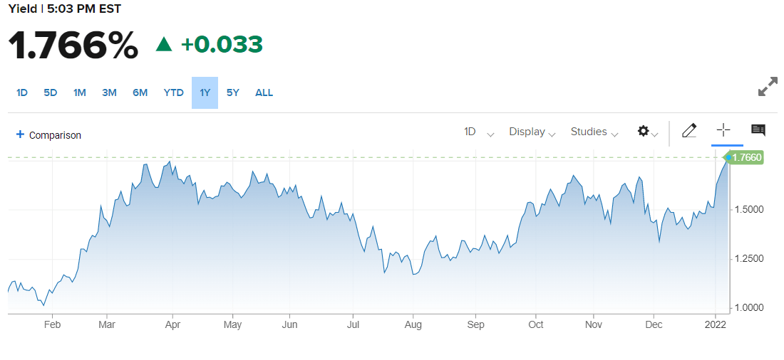 - 10-year Treasury yield rises to 1.766% a pandemic high.