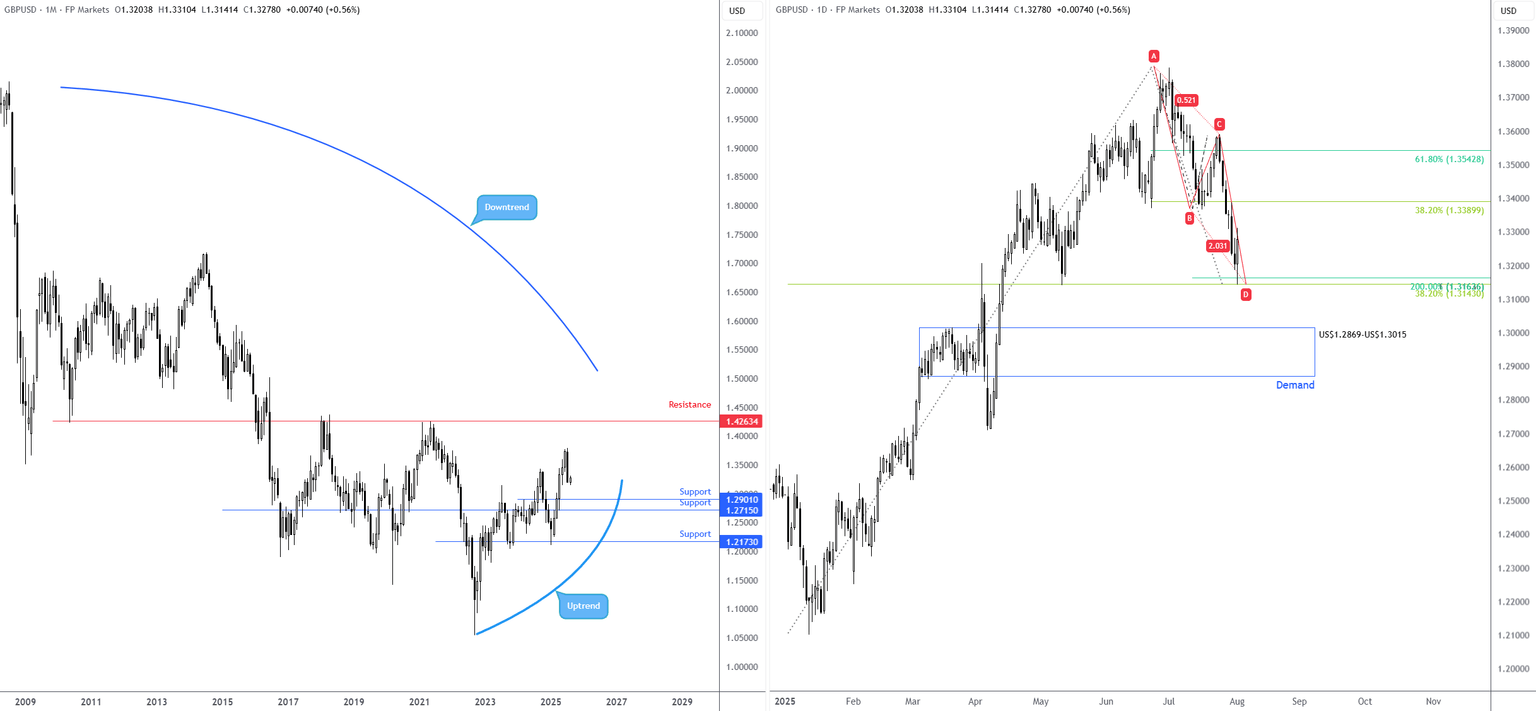 Versus the USD, we do not need a trend indicator to tell us there has been an upside bias in play since late 2022, posting a series of higher highs/lows on the monthly scale. Nevertheless, in the longer term, this market has been trending lower since 2008; therefore, the current uptrend from 2022 lows is still considered a pullback until breaching US$1.4250. Meanwhile, given the fractal nature of price action, daily price ended Friday testing an AB=CD bullish pattern at US$1.3164, formed by way of a 100% projection ratio that is complemented by a 38.2% Fibonacci retracement ratio and a 200% extension ratio. You will find AB=CD longs tend to target the 38.2% and 61.8% Fibonacci retracement ratios of legs A-D, which in this case are US$1.3390 and US$1.3543, respectively. Therefore, we could see the GBP push higher in the short-term to at least around the US$1.34 handle.