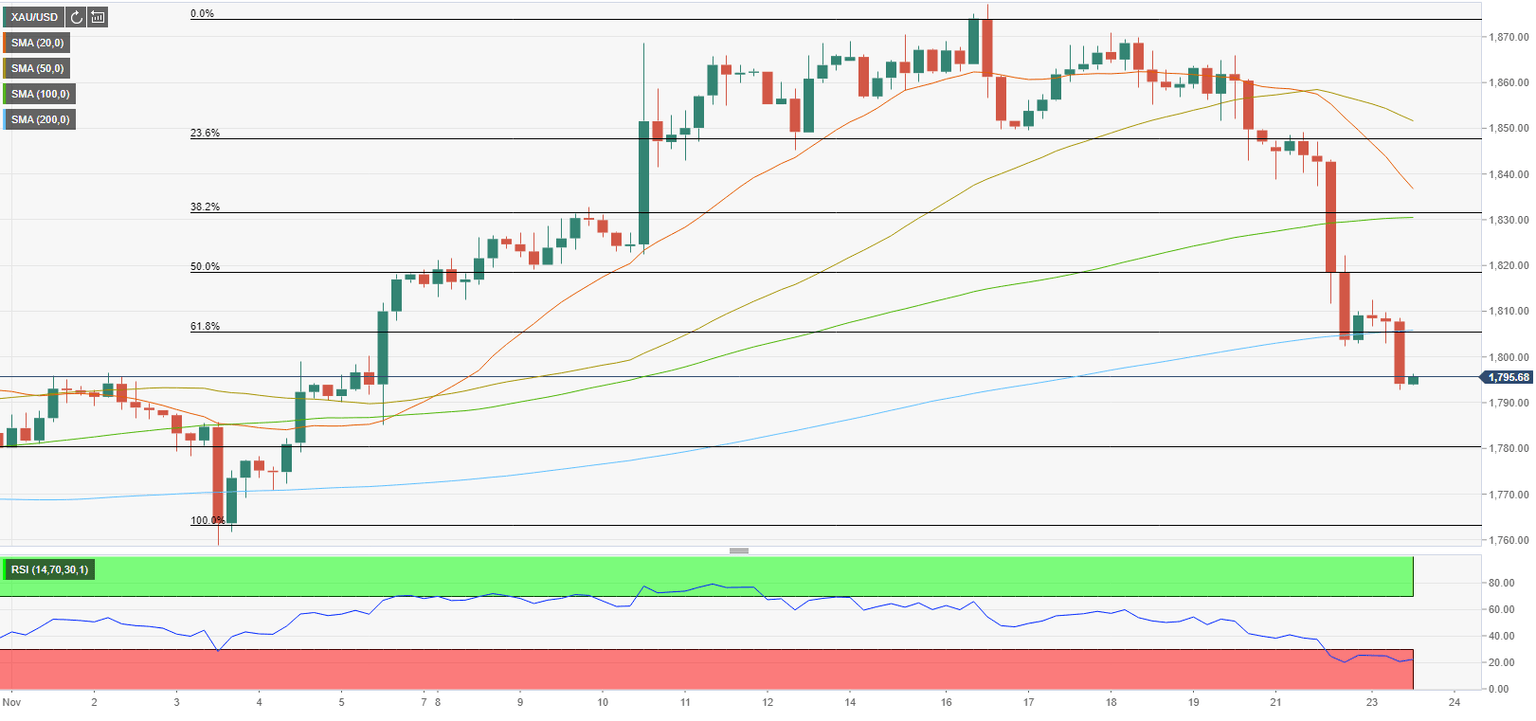 The technical picture also reveals an obvious bearish shift in the near-term outlook. Gold is trading below the 200-period SMA on the four-hour chart for the first time since November 3 and buyers have failed to defend the key $1,800 level.